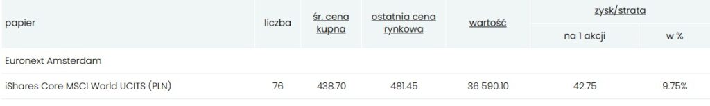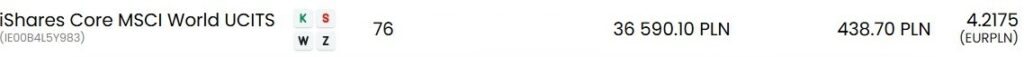 Przygotowane środki wraz z niewielką nadwyżką z poprzedniego roku (ok. 400 zł, które leżały niewykorzystane) pozwoliły na zakup łącznie 5 jednostek iShares Core MSCI World UCITS (IWDA).